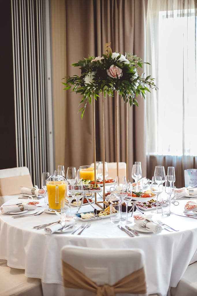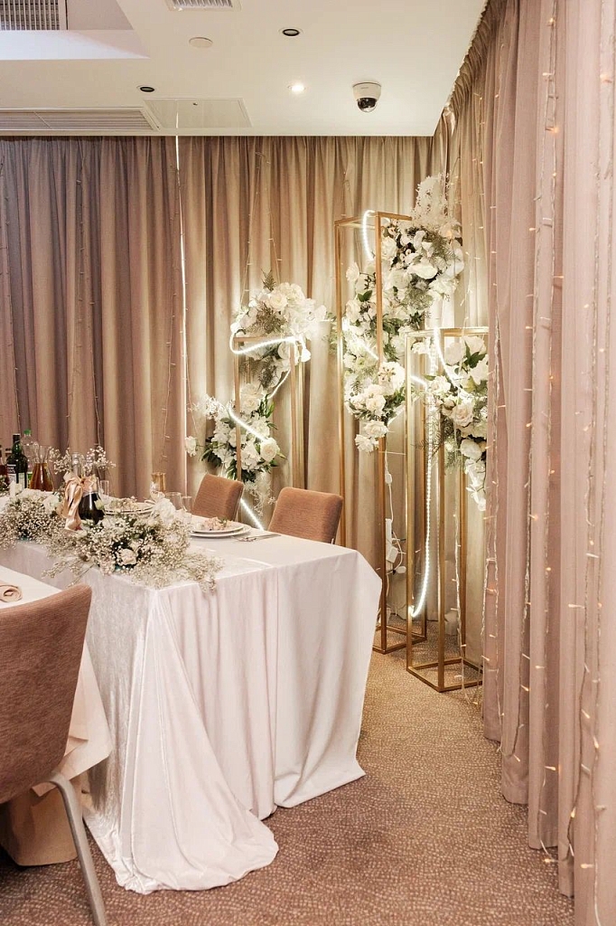 Представьте себе идеальную свадьбу в зале Терра, где каждая деталь создана для волшебного праздника. Мы предлагаем возможность разместить до 50 гостей за круглыми столами, что создаст атмосферу близости и уюта. Многоуровневое освещение подчеркнёт красоту момента, а закрытое помещение обеспечит приватность вашего торжества. В фойе, смежном с залом, вы сможете организовать фуршет, фотозону или приветственную зону для ваших гостей. Мы приготовили особый подарок – при заказе свадебного банкета вы получаете номер для молодожёнов в подарок*. Насладитесь моментами уединения и романтики в нашем уютном номере, созданном специально для новобрачных.